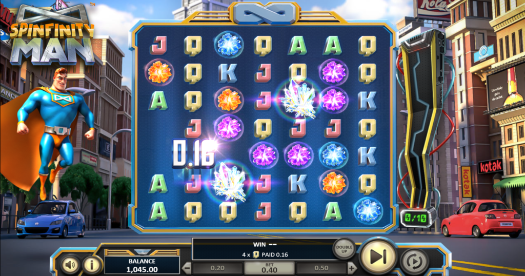 Mr. X emerges only on reels 2, 4, and 6 while each appearance progresses the “Villain Trail.” The player earns 10 free spins by finishing the Mr. X Villain Trail and receives an extra spin for each Mr. X appearance. The Spinfinity Man’s abilities become Mr. X’s weapons including the Laser Arm Cannon and Destruction Bomb to keep the base game’s action level during free spins.